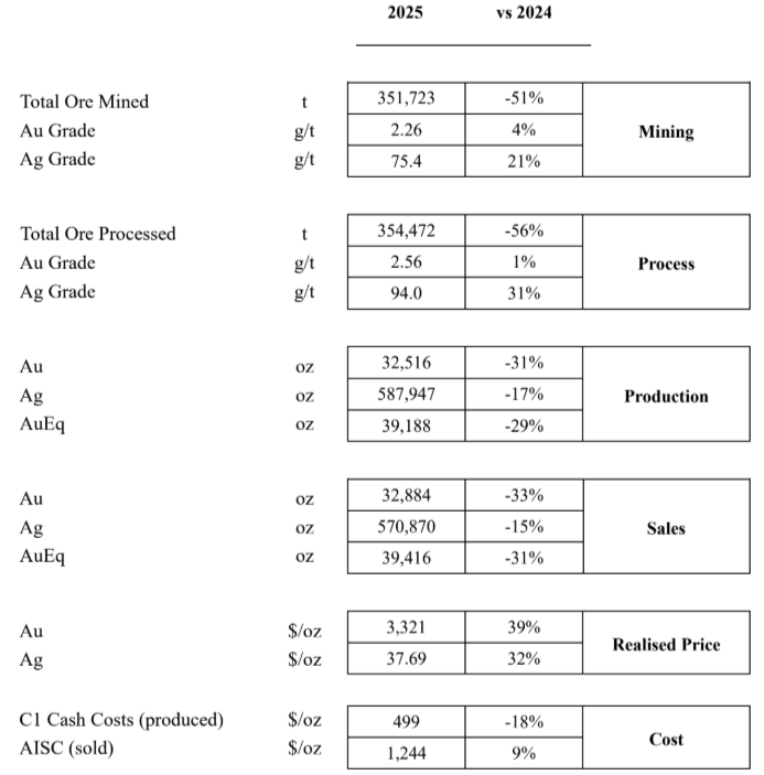 - FY2025 total ore mined was 351,723 tonnes, down 51% from 2024, reflecting natural sequencing of the mine and production plan.